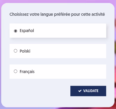 - Choix de la langue par l’utilisateur : l’apprenant peut sélectionner la langue au moment de démarrer l’activité. Même si sa langue par défaut est l’anglais ou qu’elle n’est pas renseignée, il peut décider de passer le test dans la langue de son choix parmi celles disponibles pour la base.