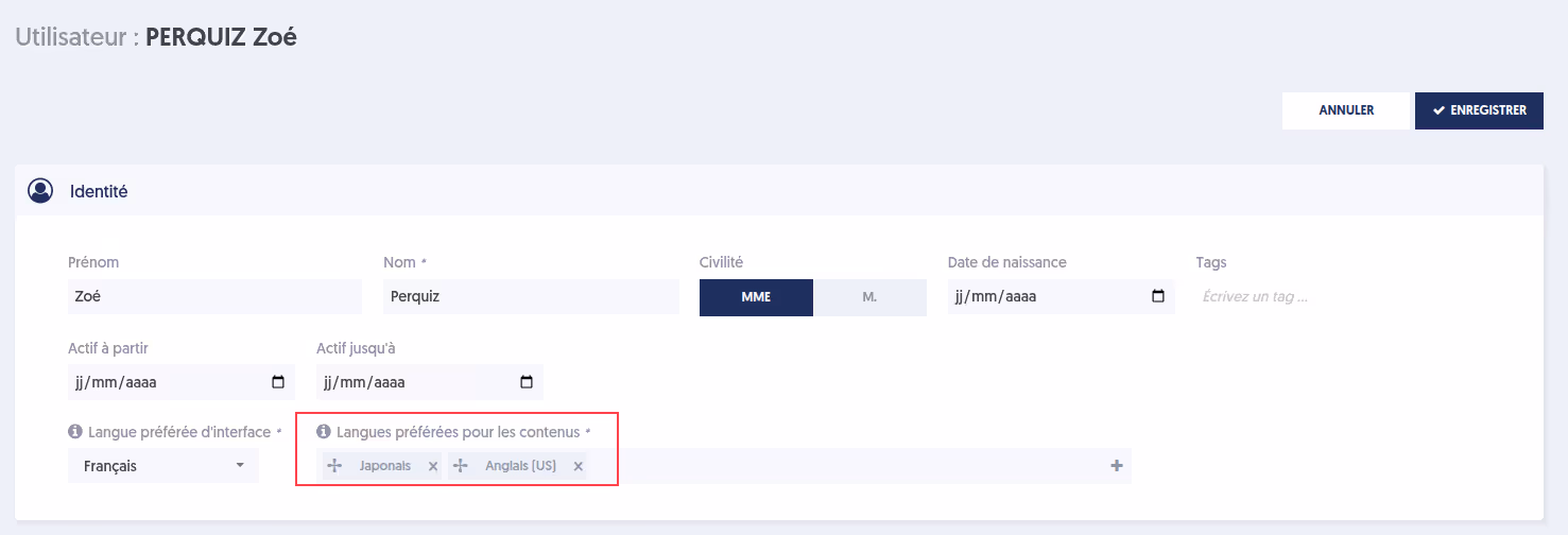 Les langues préférées de Zoé sont définies dans son profil.