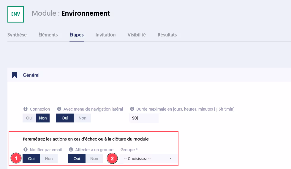 Vous pouvez paramétrer les actions en cas d’échec ou à la clôture d’un module.