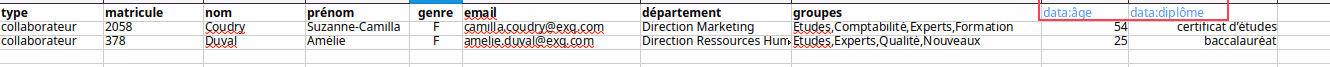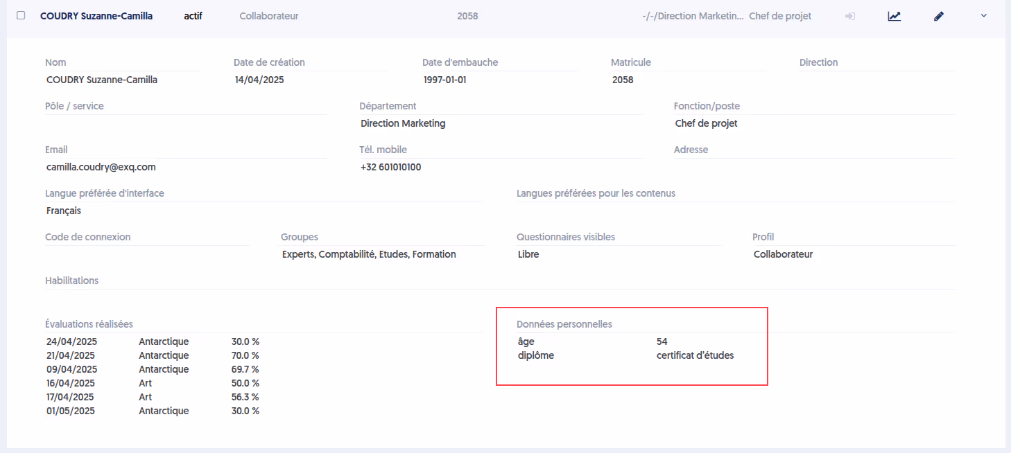 Experquiz permet d’importer des données personnelles spécifiques d’un utilisateur dans le fichier d’import (sous le format data:xxx). Notez bien que l’on ne parle pas ici des données personnelles usuelles telles que nom, prénom, date de naissance, etc. Il s’agit d’attributs tout à fait spécifiques définis par l’entreprise.