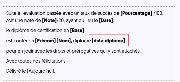 Ces données peuvent être insérées comme variable dans la rédaction des diplômes en utilisant la syntaxe [data.xxx]