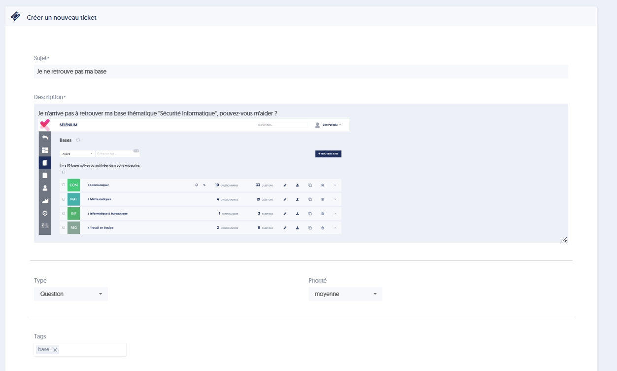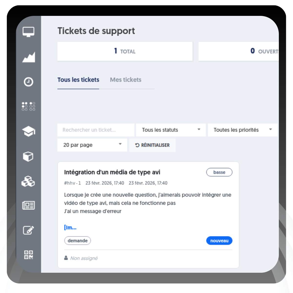 La fonctionnalité Ticketing vous permet de gérer vos demandes de toute nature, (simple question, possible anomalie, demande d’intervention, …), de les centraliser, de les qualifier par niveau de priorité et d’en assurer une traçabilité complète jusqu’à leur résolution.